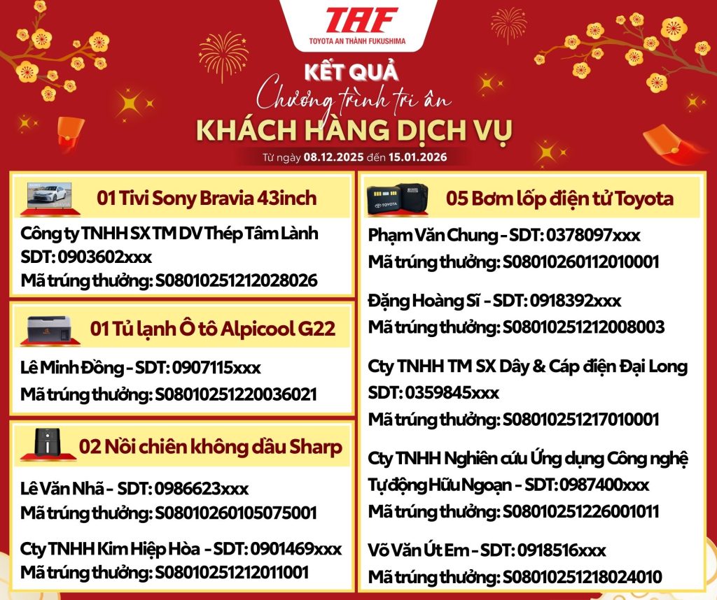 Sáng ngày 17.01.2026, Toyota An Thành Fukushima – TAF đã tổ chức quay số và đã tìm ra 9 khách hàng may mắn nhận các giải thưởng giá trị của chương trình “TRI ÂN KHÁCH HÀNG DỊCH VỤ NĂM 2025”.