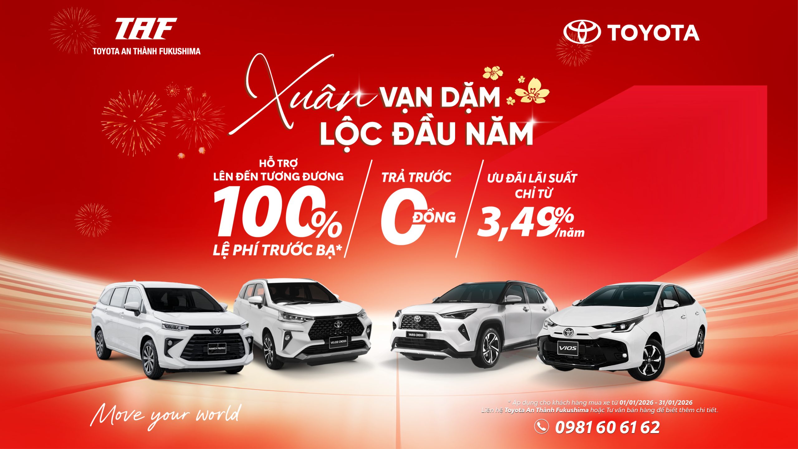 KHUYẾN MÃI TOYOTA: XUÂN VẠN DẶM, LỘC ĐẦU NĂM Toyota An Thành Fukushima – TAF triển khai chương trình khuyến mãi siêu ưu đãi dành cho khách hàng mua xe Toyota mới trong tháng 1.2026. Cụ thể như sau: ♥ Thời gian: từ 01.01.2026 đến 31.01.2026 ♥ Quà tặng khủng ⇒ Ưu đãi 100% […]