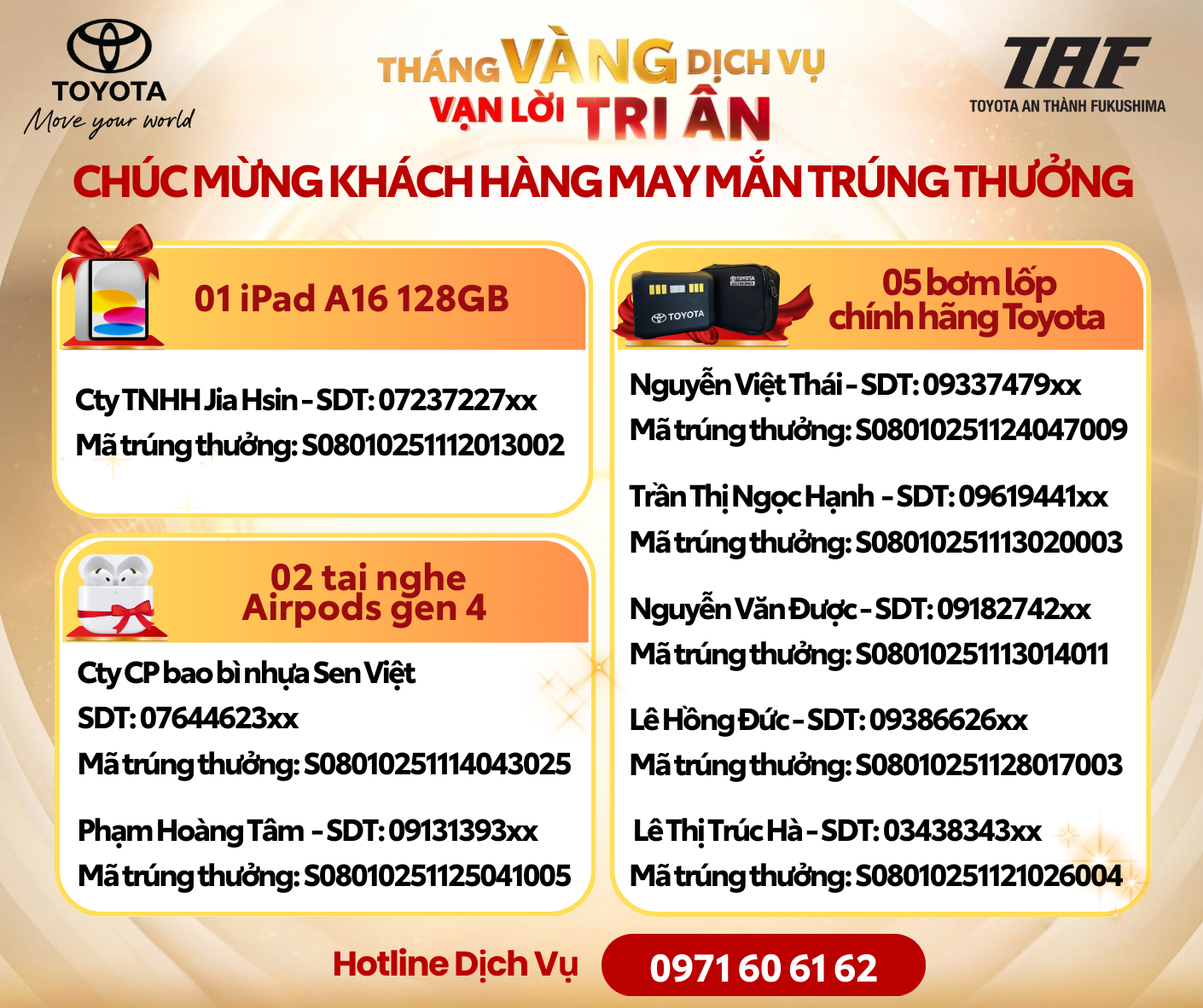 Toyota An Thành Fukushima công bố khách hàng trúng thưởng chương trình khuyến mãi dịch vụ tháng 11.2025