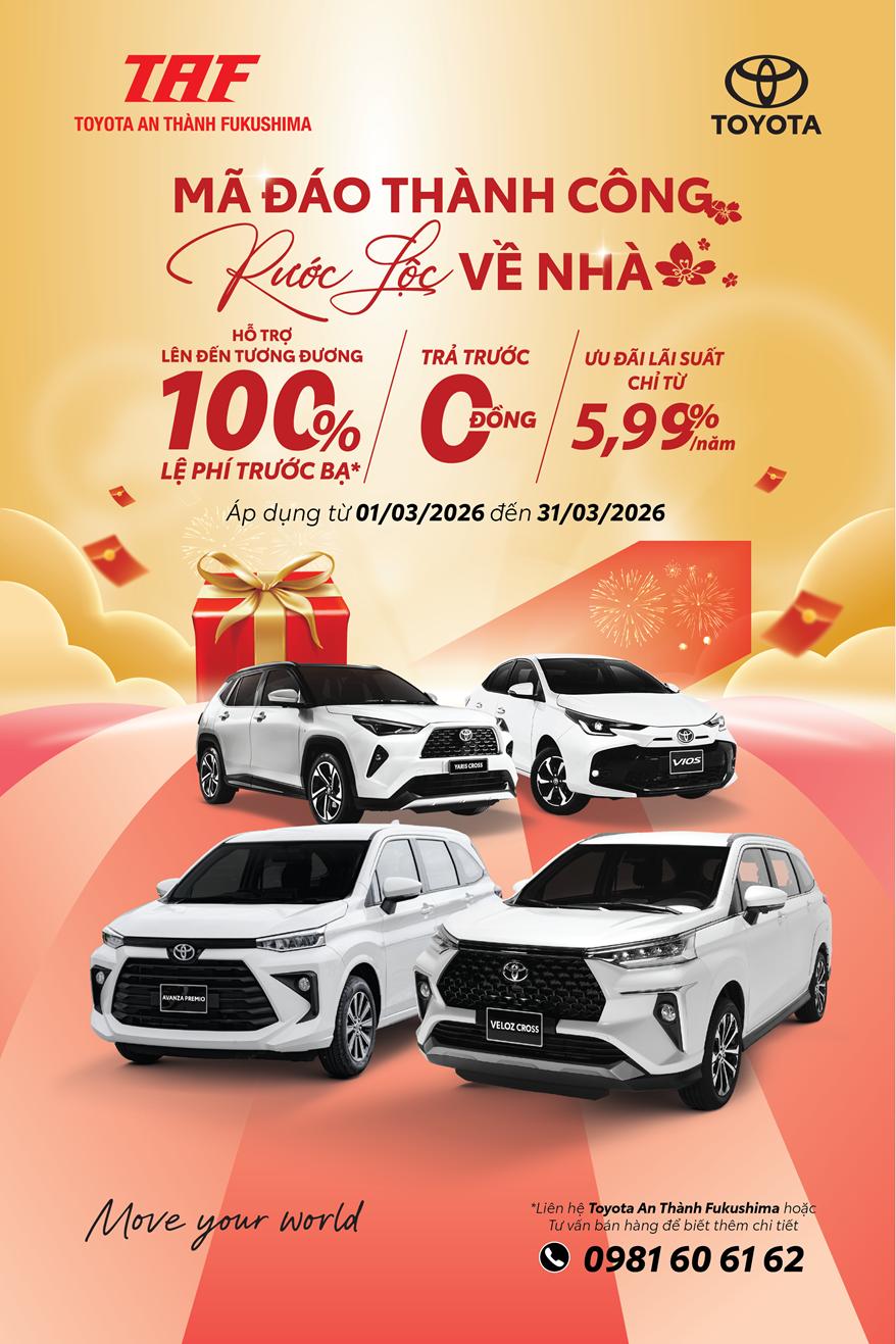 KHUYẾN MÃI TOYOTA: MÃ ĐÁO THÀNH CÔNG, RƯỚC LỘC VỀ NHÀ Toyota An Thành Fukushima – TAF triển khai chương trình khuyến mãi siêu ưu đãi dành cho khách hàng mua xe Toyota mới trong tháng 03.2026. Cụ thể như sau: ♥ Thời gian: từ 01.03.2026 đến 31.03.2026 ♥ Quà tặng khủng ⇒ Ưu […]