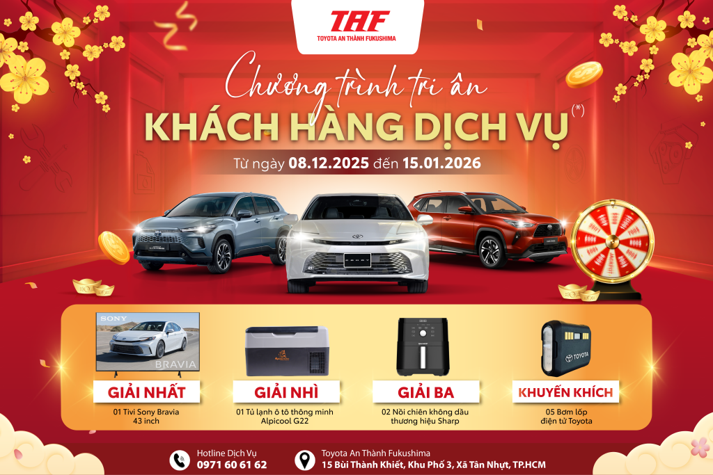 Với mong muốn tri ân khách hàng đã luôn tin yêu và đồng hành cùng Toyota An Thành Fukushima – TAF trong suốt 10 năm qua, Phòng Dịch vụ TAF triển khai chương trình khuyến mãi “Tri ân Khách hàng Dịch vụ cuối năm” dành cho tất cả các khách hàng làm dịch vụ tại đại lý từ ngày 08.12.2025 đến 15.01.2026.
