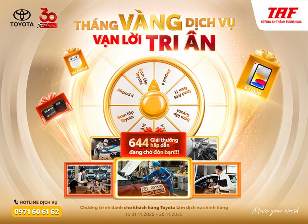 Với mong muốn tri ân khách hàng đã luôn tin yêu và đồng hành cùng Toyota trong suốt 30 năm qua, Toyota Việt Nam cùng Toyota An Thành Fukushima – TAF triển khai chương trình khuyến mãi “Tháng vàng dịch vụ, vạn lời tri ân” dành cho tất cả các khách hàng làm dịch vụ tại hệ thống đại lý toàn quốc từ ngày 01/11 – 31/11/2025 với thông tin chi tiết như sau: